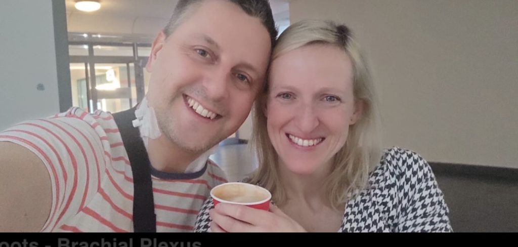 Łukasz z żoną kilka dni po wypadku. Uśmiech mimo bólu. Lewa ręka całkowicie niesprawna.