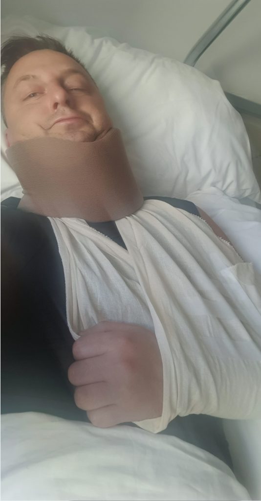W wyniku wypadku doszło do wstrząśnienia rdzenia kręgowego oraz wyrwania nerwów splotu barkowego (C5, C6, C7, C8, Th1). Oznacza to całkowitą utratę władzy w lewej ręce oraz silny, przewlekły ból neuropatyczny, który utrudnia sen, codzienne funkcjonowanie i uniemożliwia normalną pracę.